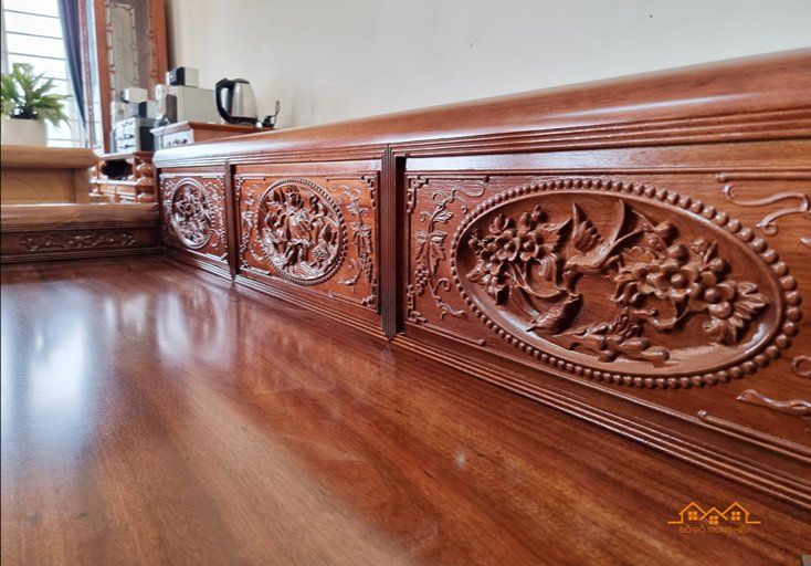 Bộ này được chế tác từ 100% Gỗ Gụ Lào (Gõ mật) đã qua tuyển chọn, không rác, không dập.