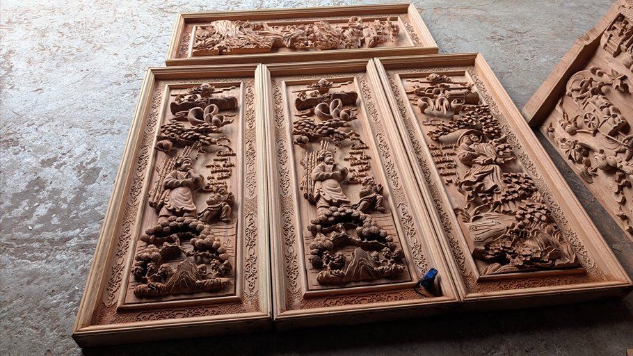 Kỹ thuật Kênh Bong: Các bác nhìn kỹ sẽ thấy các chi tiết cây tùng, hòn đá, gánh củi được đục tách hẳn nền (kênh bong), tạo độ sâu hun hút rất nghệ thuật.