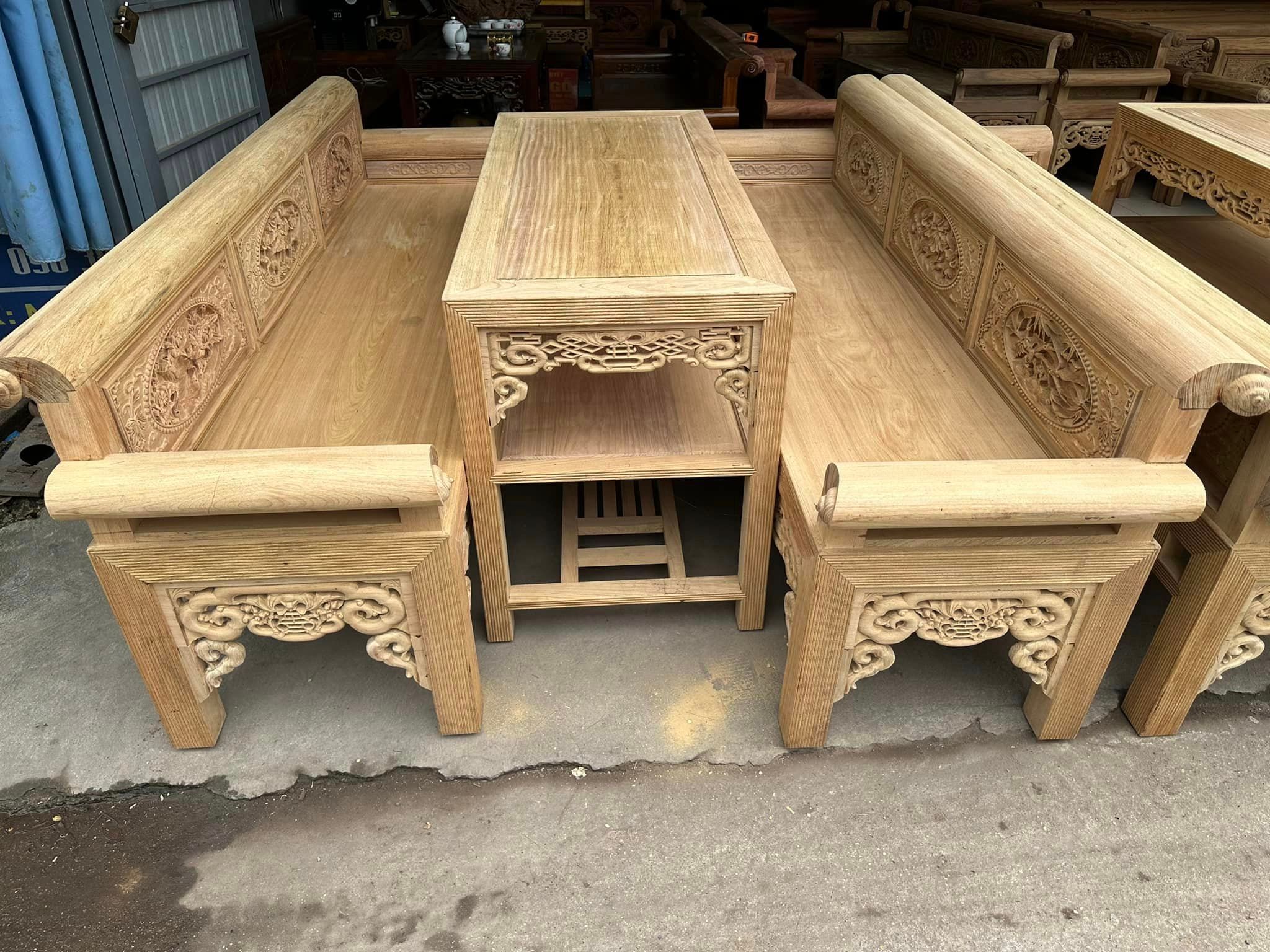 Không chạy theo hàng đục máy CNC công nghiệp, bộ trường kỷ này được đục tay thủ công kênh bong.