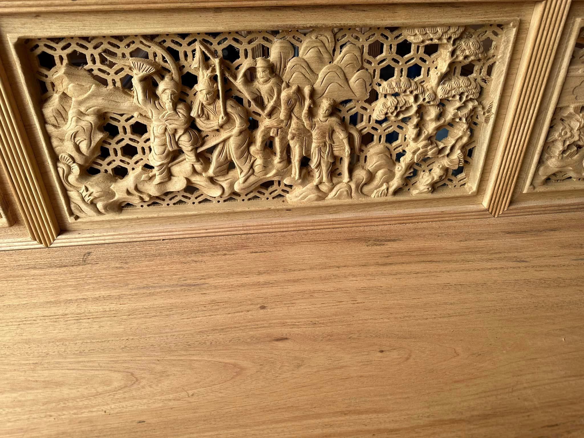 Khác với những mẫu đục hoa lá thông thường, bộ ghế này tái hiện lại sự hào hùng của thời kỳ Tam Quốc.
